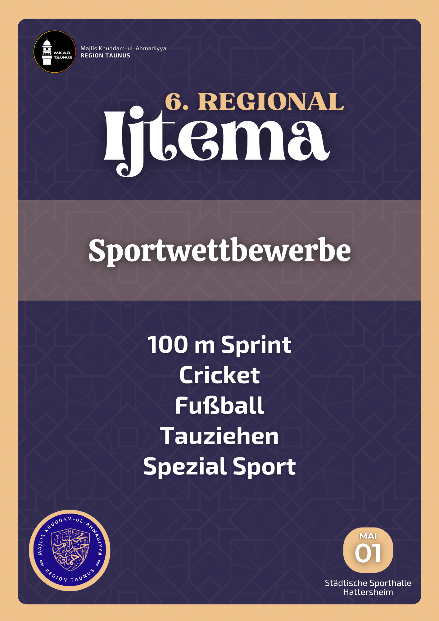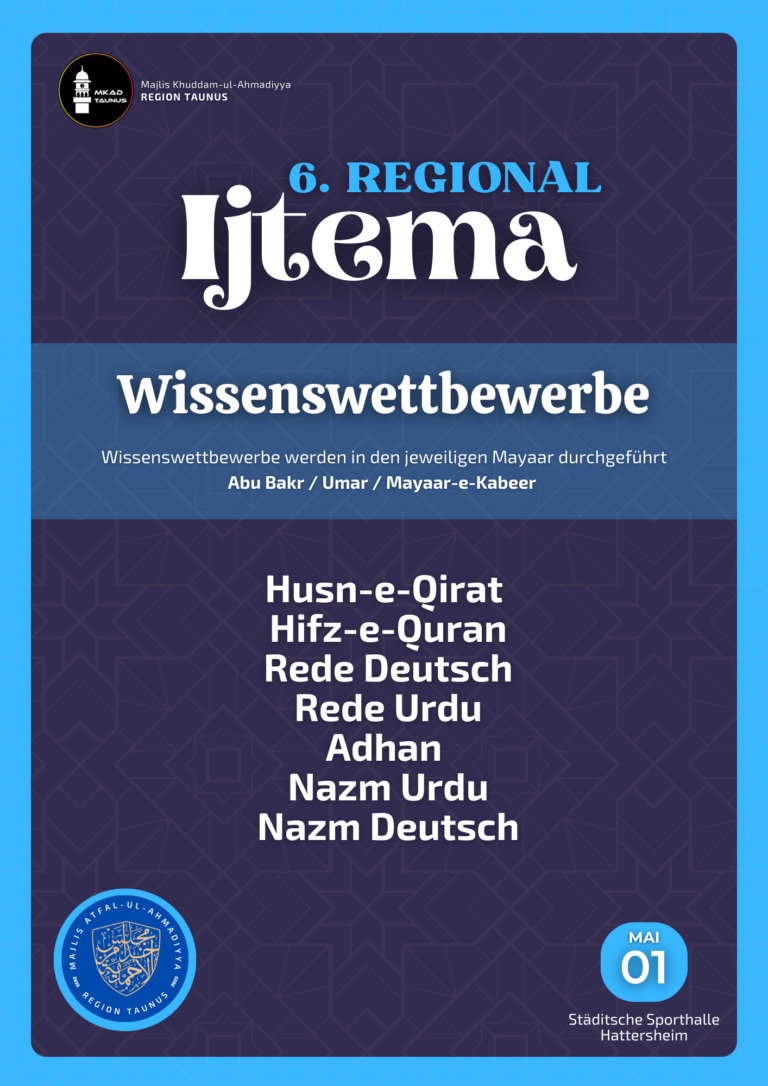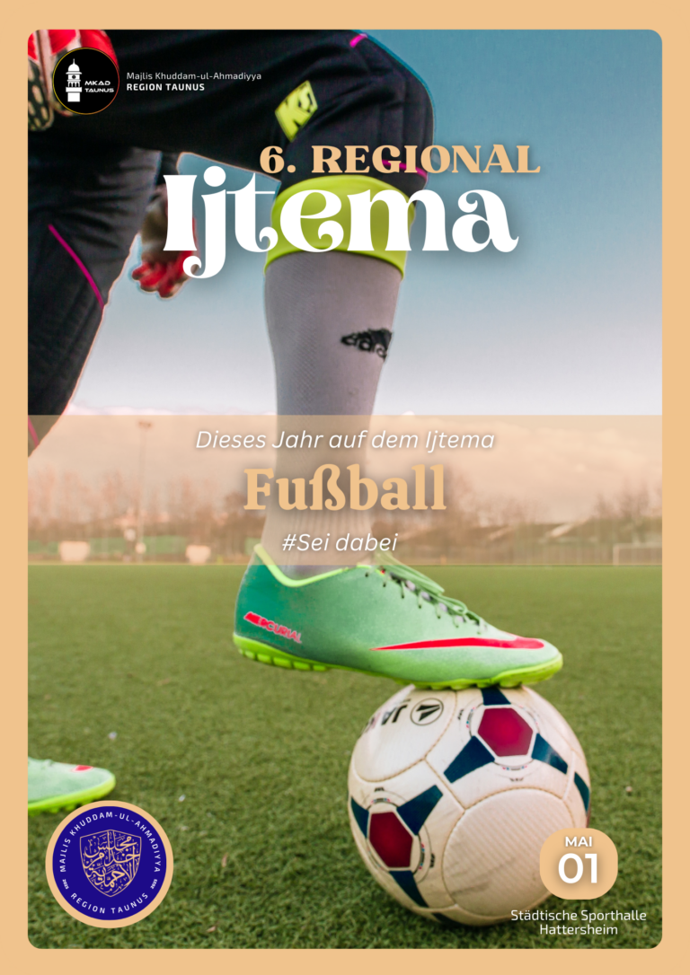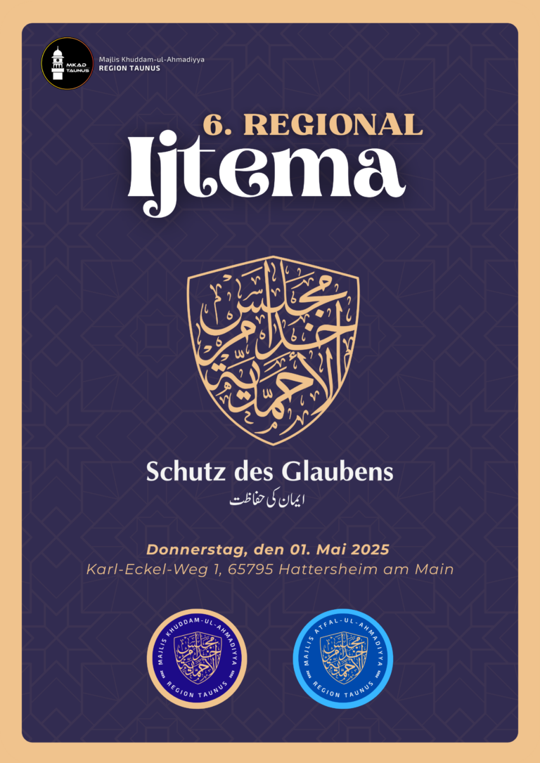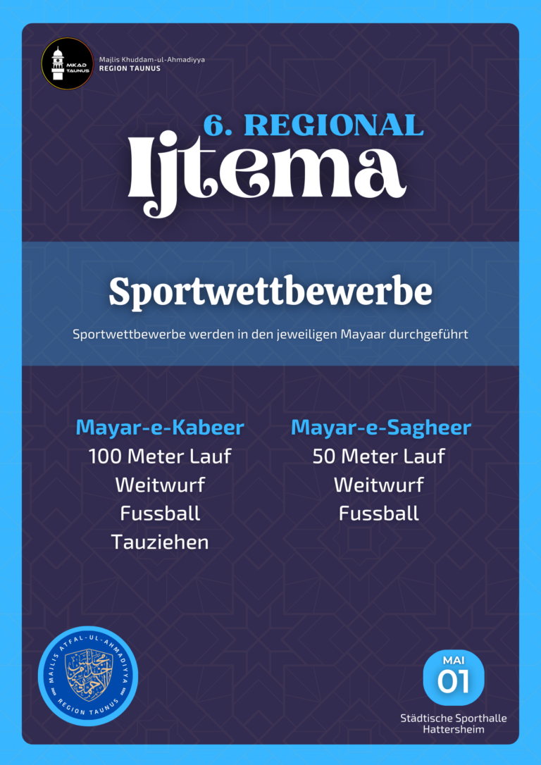 Durch die Gnade Allahs hat die Region Taunus die Möglichkeit das Regional Ijtema 2025 veranstalten zu dürfen. In diesem Jahr wird das Ijtema erneut in der städtischen Sporthalle Hattersheim stattfinden, wo bereits zuvor Regional Ijtema’at abgehalten wurden.